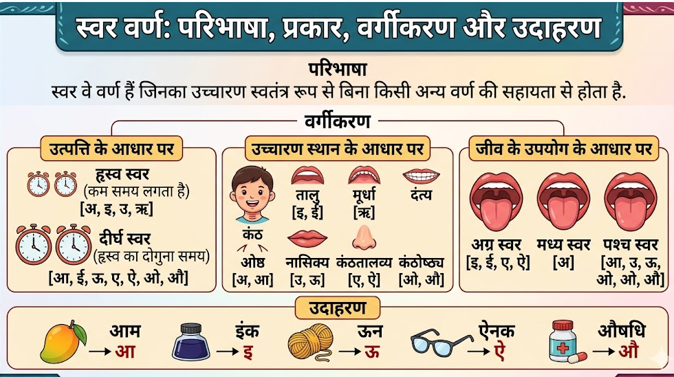 स्वर (Vowels): – वे स्वर वर्ण जिनका उच्चारण स्वतंत्र रूप से होता है। उन्हें स्वर कहते हैं। हिन्दी में मुख्य रूप से 11 स्वर है(अ, आ, इ, ई, उ, ऊ, ऋ, ए, ऐ, ओ, औ) इन्हें मात्राओं के रूप में व्यंजनों के साथ प्रयोग किया जाता है।