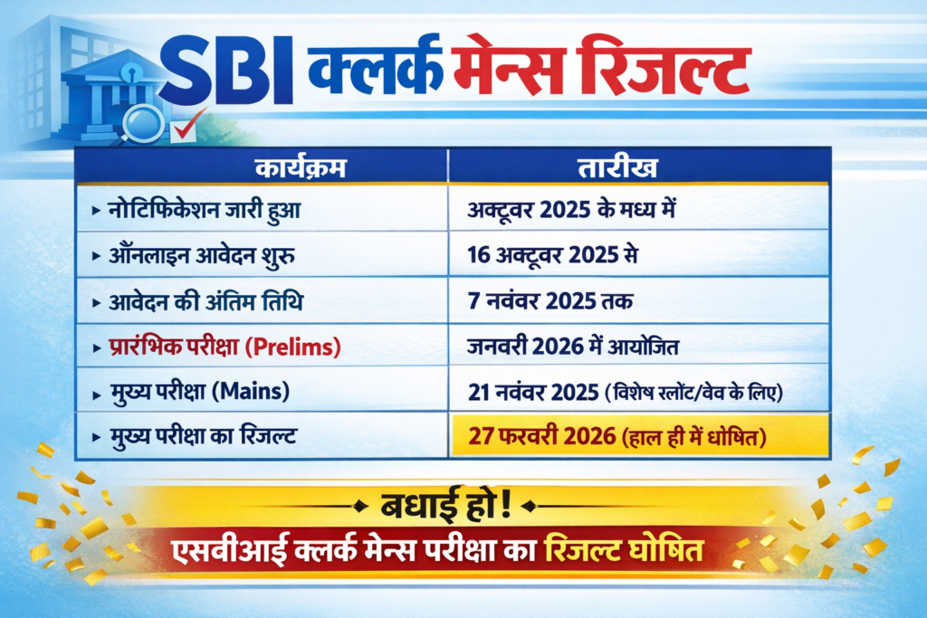 भारतीय स्टेट बैंक (SBI) ने हाल ही में Junior Associate (Customer Support & Sales) के पदों के लिए आयोजित SBI Clerk Mains Result 2025 की घोषणा कर दी है। यह परीक्षा 21 नवंबर 2025 को सफलतापूर्वक आयोजित की गई थी, जिसमें देशभर के हजारों उम्मीदवारों ने भाग लिया था।